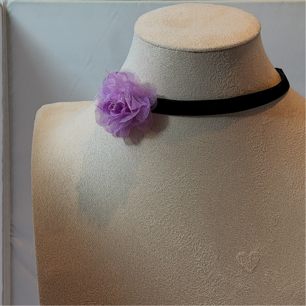 Choker zwart satijnen lint met lilakleurige bloem